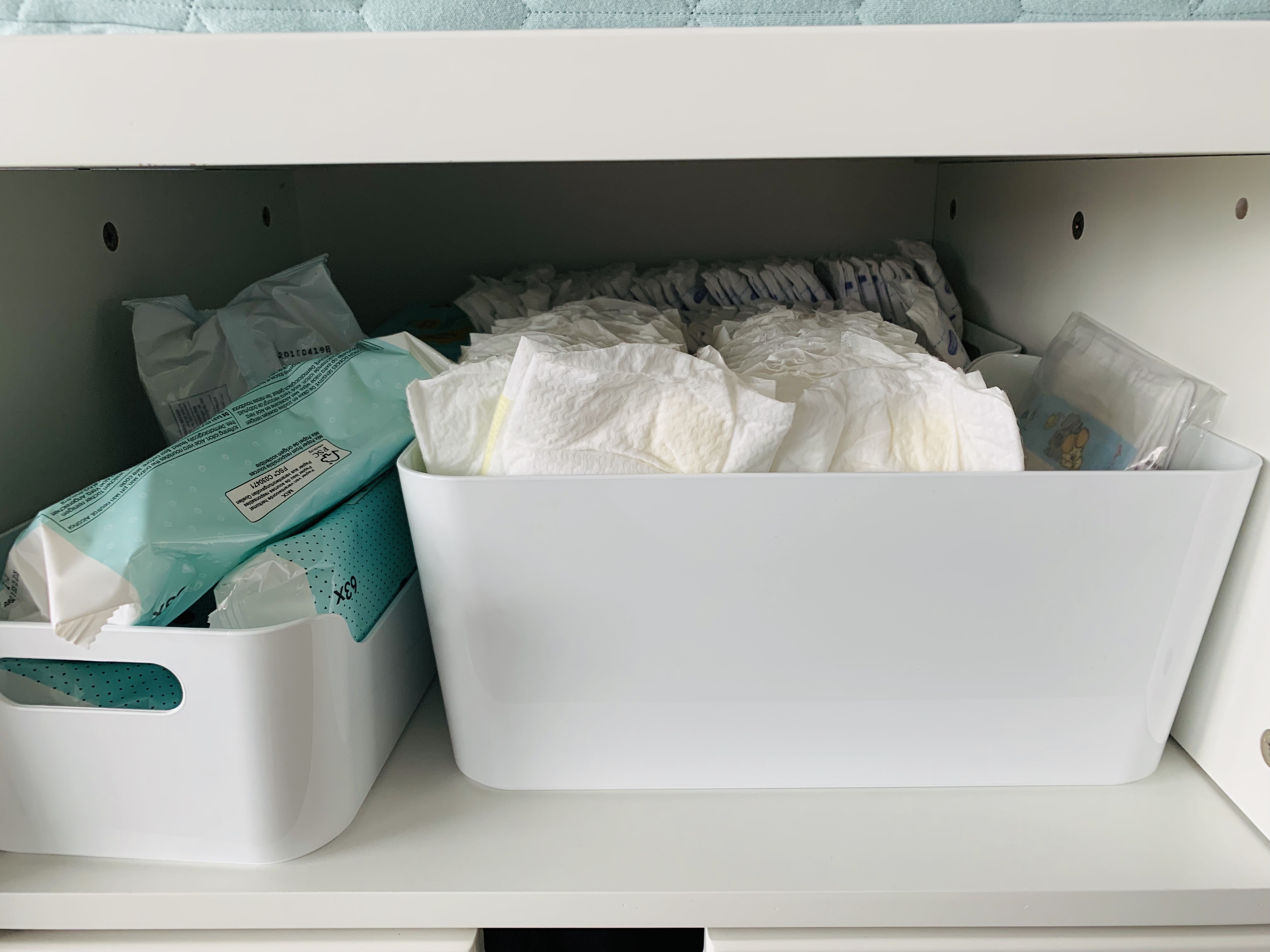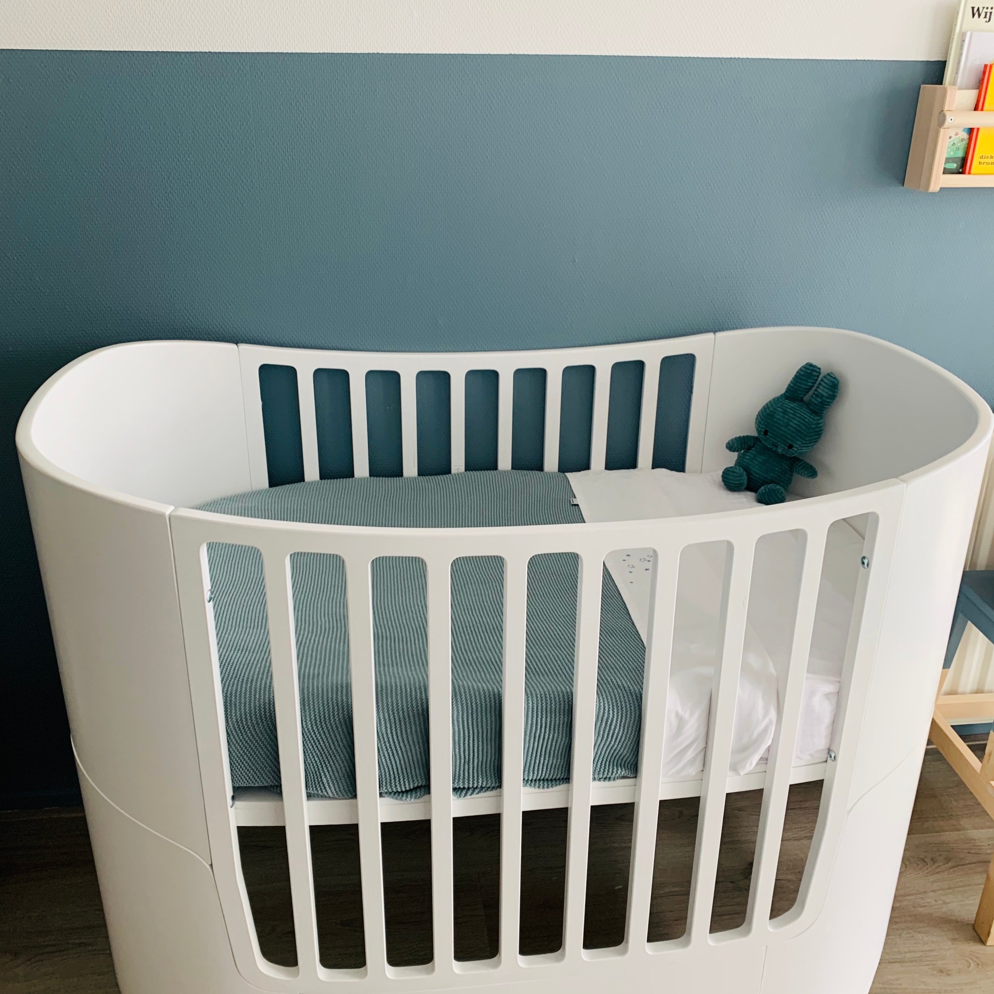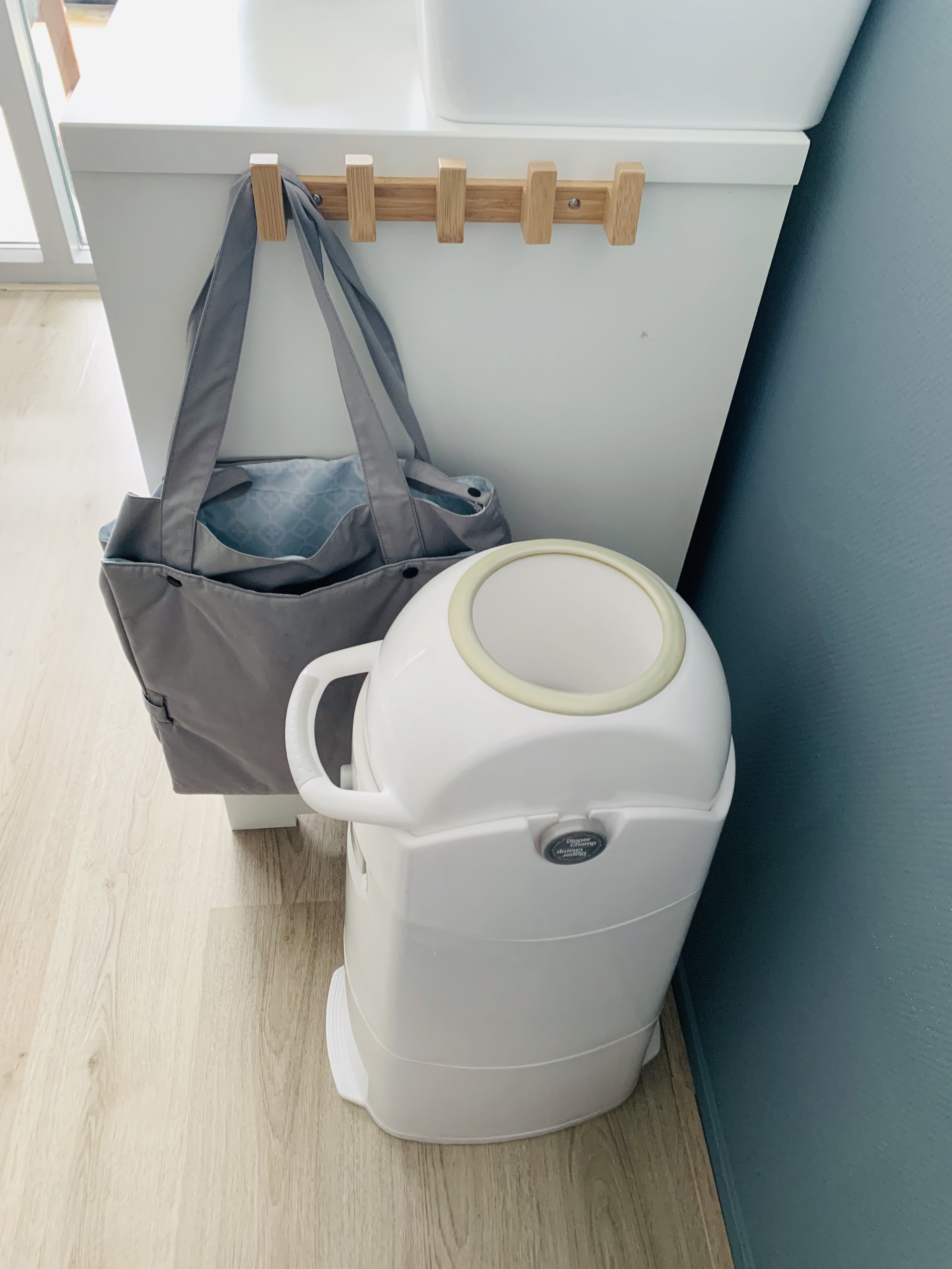 Ik dwaal af.. Maar dat gebeurt ook regelmatig. Als je op Pinterest gaat kijken zijn er vele mama’s die je vertellen wat ze absoluut onnodig vonden, vaak achteraf. De billendoekjeswarmer was een terugkerend thema, dus die krijg je vast van mij: niet nodig. En verder kun je veel inspiratie opdoen, qua aankleding en indeling. Hele tutorials over hoe je de commode het beste kunt inpakken. Goed voor vele uren vermaak. Wij hebben wat rekjes voor knuffels en boeken, plankjes voor items die we willen laten zien, en een nachtlampje. Ohja, de kleur op de muur is ‘Denim Drift’ van Flexa, het bedje van Leander, de cosleeper van Chico Next2Me, de luieremmer heet Diaper Genius, en de rest is van IKEA!