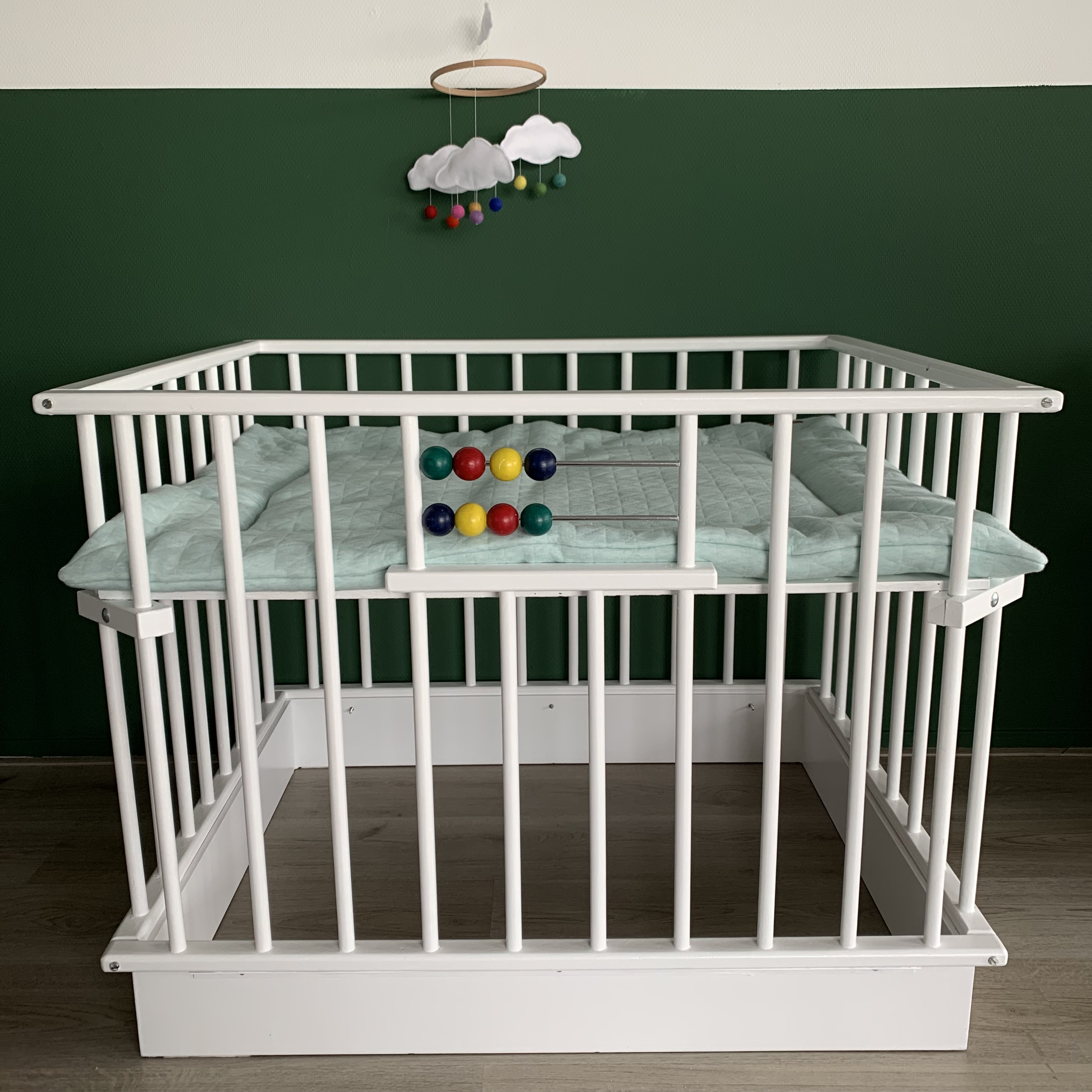 Maar er is nog zoveel meer om uit te kiezen! Een rondje in bijvoorbeeld Babypark laat je zien dat je er nog láng niet bent. Mijn opa (timmerman) maakte ooit voor mij een box. En ergens in de jaren daarna, voor een van de andere kleinkinderen, maakte hij er ook klosjes bij die aan de tralies/spijlen vastgemaakt kunnen worden, zodat je niet zo diep hoeft te bukken met een baby, omdat je zo de bodem kunt verhogen. Topvakman, die opa van mij, want met een likje verf staat deze box te ‘shinen’ in onze woonkamer! Boxkleed erin, en hij is af. Inclusief de oude kralen om mee te spelen. Ohja! Kreeg ik dit weekend de Fisher Price Activity Center van een vriendinnetje te leen.. voor in de box, die originele, die wij vroeger ook hadden. Moet je echt even op Google opzoeken, brengt allerlei herinneringen boven! Mijn broertje (32) kon er niet op uitgespeeld raken, en hij ging bijna mee naar zijn huis. En afgelopen zaterdag was het Koningsdag.. heeft mama een prachtige Fisher Price Garage voor 1 euro gescoord! Winnen! Hetzelfde broertje bood aan om daar vast ‘op te passen’.