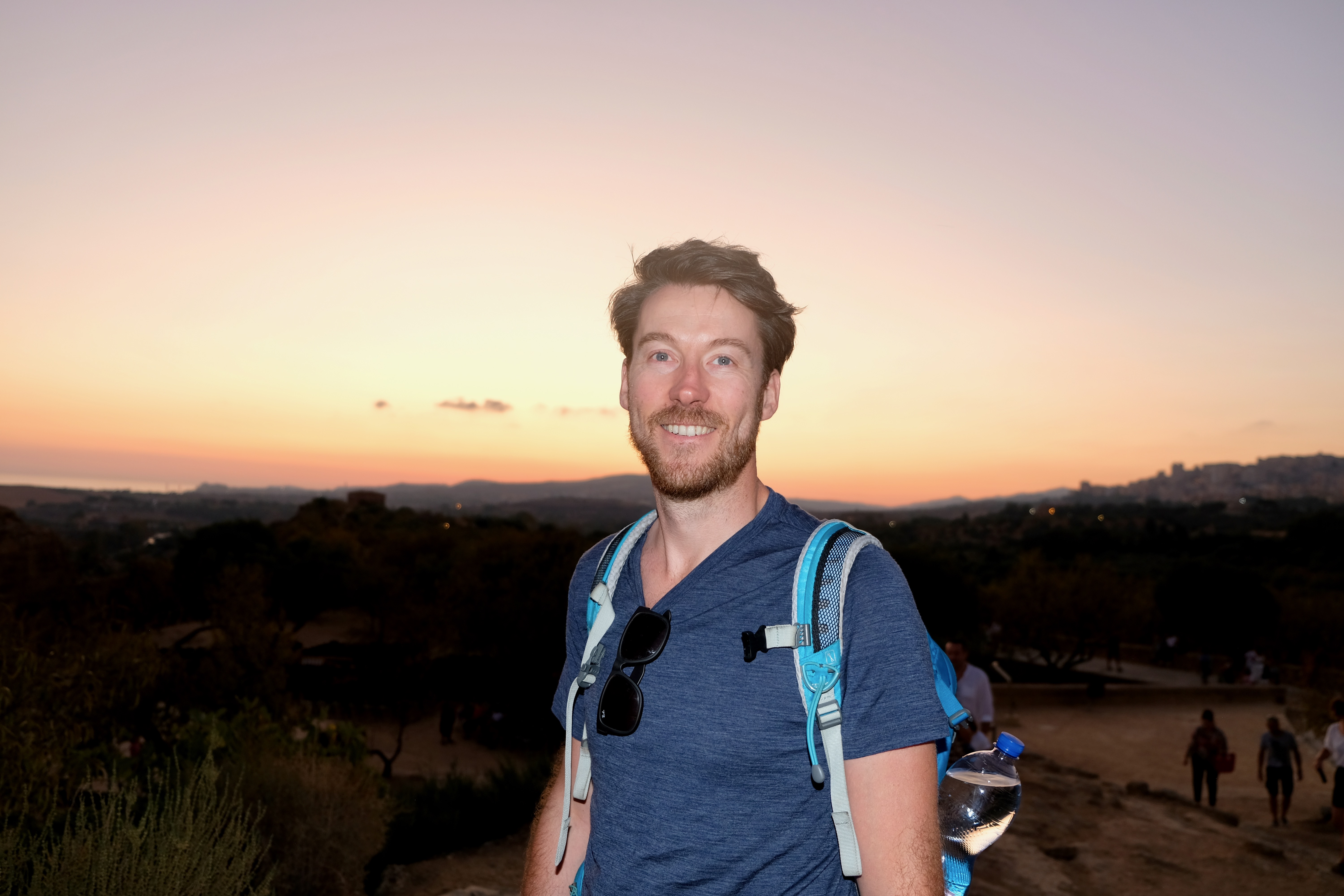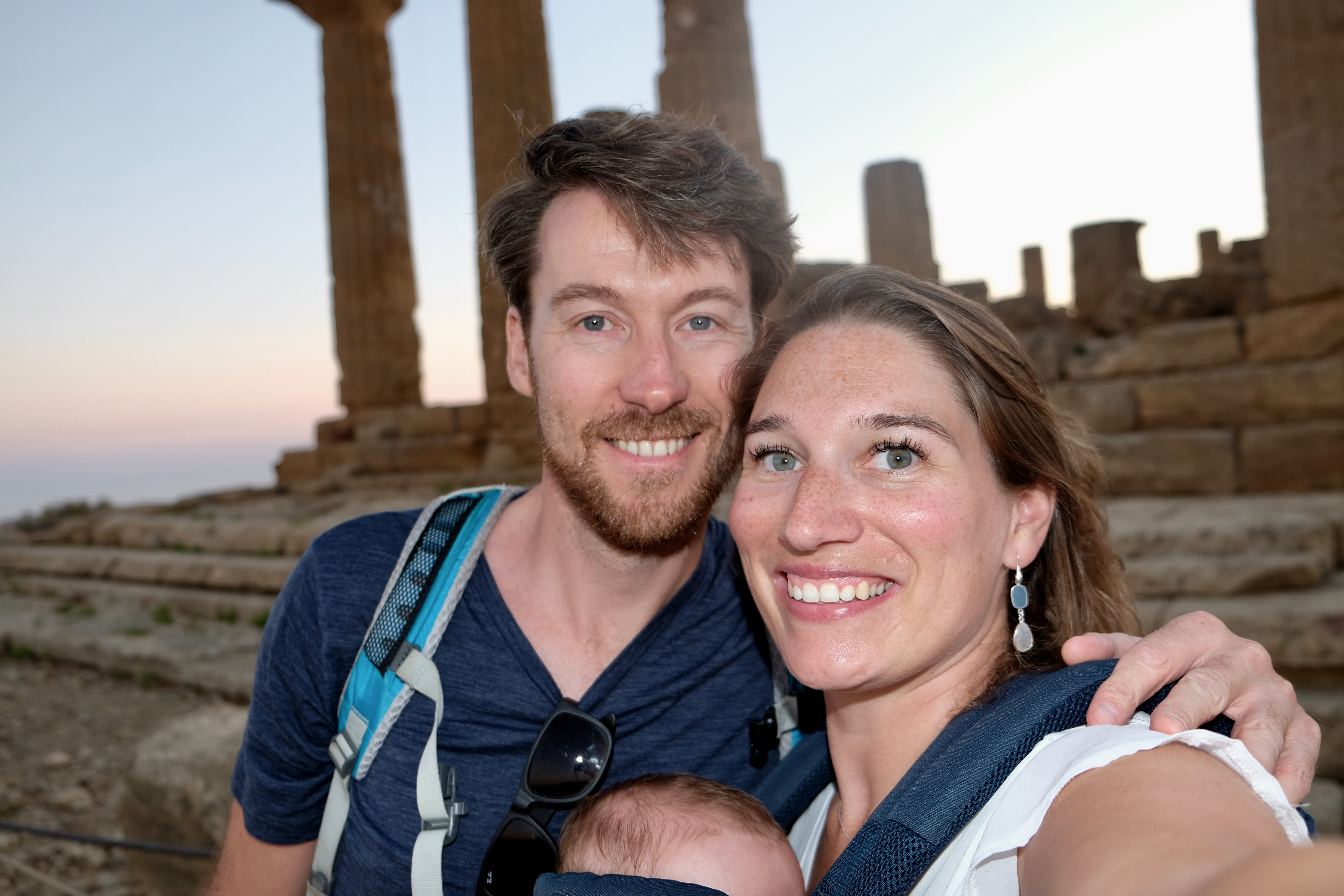 We lopen van de tempel van Juno/Hera Lacinia (gebouwd in de 5e eeuw voor Christus) naar de tempel van Zeus/Jupiter, terwijl de zon ondergaat en de tempels verlicht worden. Er staat een briesje en het is relatief koel. Zo is het goed te doen! Met Siebe in de draagzak (grotendeels slapend) bekijken we de immense gebouwen. Niet alles krijgen we mee in het donker, maar het is zeker de moeite waard. Ook leuk, er stond stiekem boven een enorme rij, maar ouders met kleine kinderen mogen voor. Lief van die Italianen. Zo heeft Siebe zijn eerste ‘oude stenen’ echt bewonderd. Grotendeels slapend.