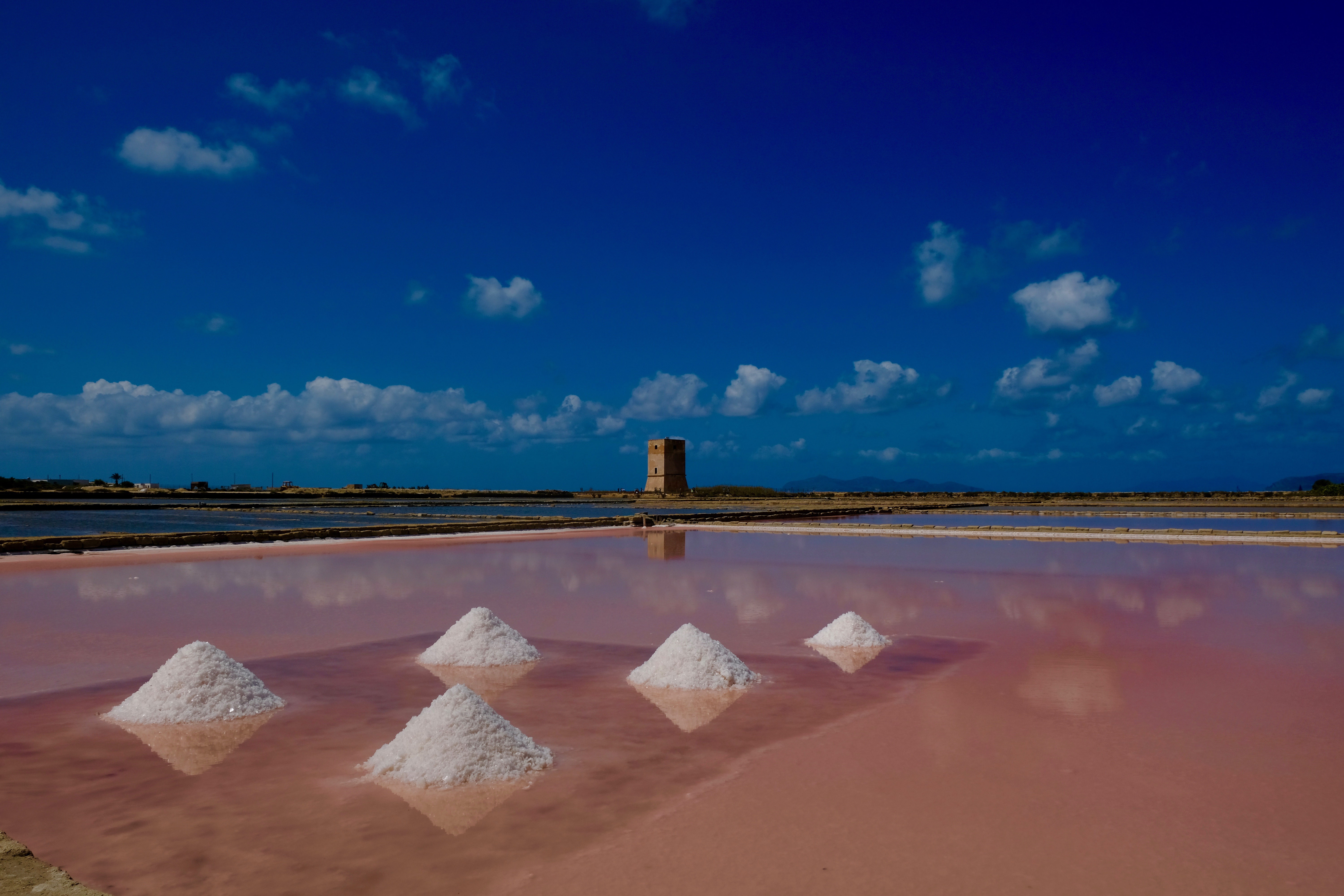 De volgende ochtend besluiten we naar de nabijgelegen zoutwinnerij te gaan. Hier bezoeken we het museum in een oude molen, en leren over de winning van (zee)zout. Het is een mooi proces, en de foto’s van vroeger geven een levendig beeld over hoe het was. Stel je even voor, in 40 graden met je voeten in intens zout water, witte vlakten, geen zonnebrand, geen zonnebril en een doek om je hoofd geknoopt. Betaald kreeg je per zoutmand, en ze werken van 3 uur ’s nachts tot 3 uur ’s middags. Loeizwaar. Inmiddels is het allemaal overgenomen door machines (hoewel de eerste machines vanwege roest niet direct een succes waren). Omdat het nu ook augustus is zijn we er precies op tijd om de oogst te zien. Het lijken wel bergen sneeuw. Wist je trouwens dat er in september zelfs flamingo’s zijn? Zij zijn roze doordat ze garnalen eten die roze kleurstof in zich hebben, en het water kleurt hier en daar ook roze. Het zout dan weer niet, dat is ‘gewoon’ wit, door alle biologische processen waarbij het gezuiverd wordt. Niks uit de fabriek bij.
