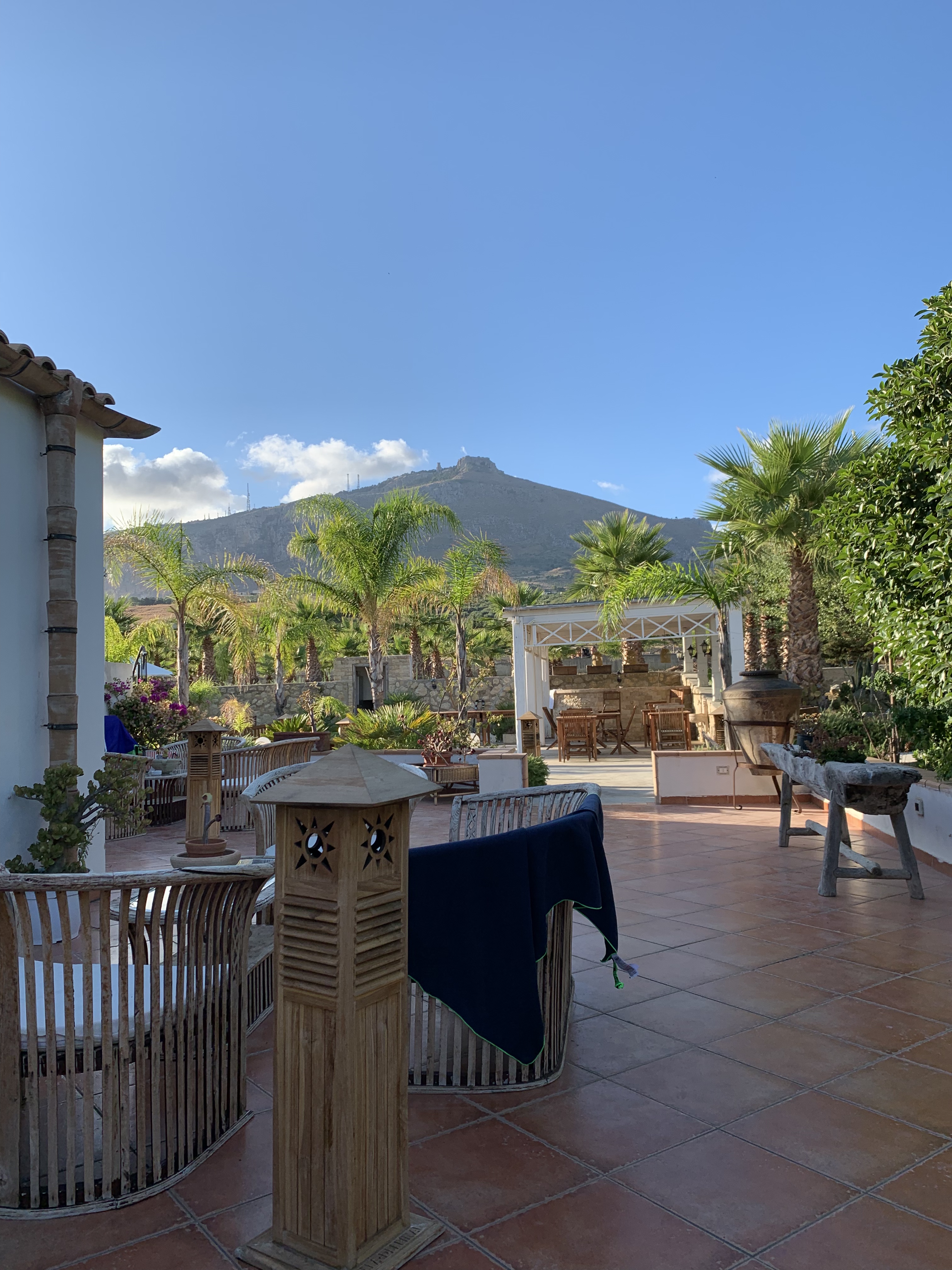 In de buurt van. Want naar Trapani zijn we niet geweest! Na een wederom succesvolle autorit kwamen we aan in Villa delle Palma Delfina, een agriturismo in de buurt van Trapani, aan de voet van de Erice. Het is een landhuis, gelegen aan een laan vol palmbomen. De kamer was prima, de badkamer klein, er was een zwembad en een prima ontbijt. Het enige wat miste was een restaurant. Maar met een olijvenbrood van de Lidl, smeersels, en een salade hadden we zo een diner in elkaar geklust. De eerste avond bleven we buiten hangen. Na het lezen van alle boeken over slapen lukte het ons zowaar om Siebe binnen afzienbare tijd te laten slapen.