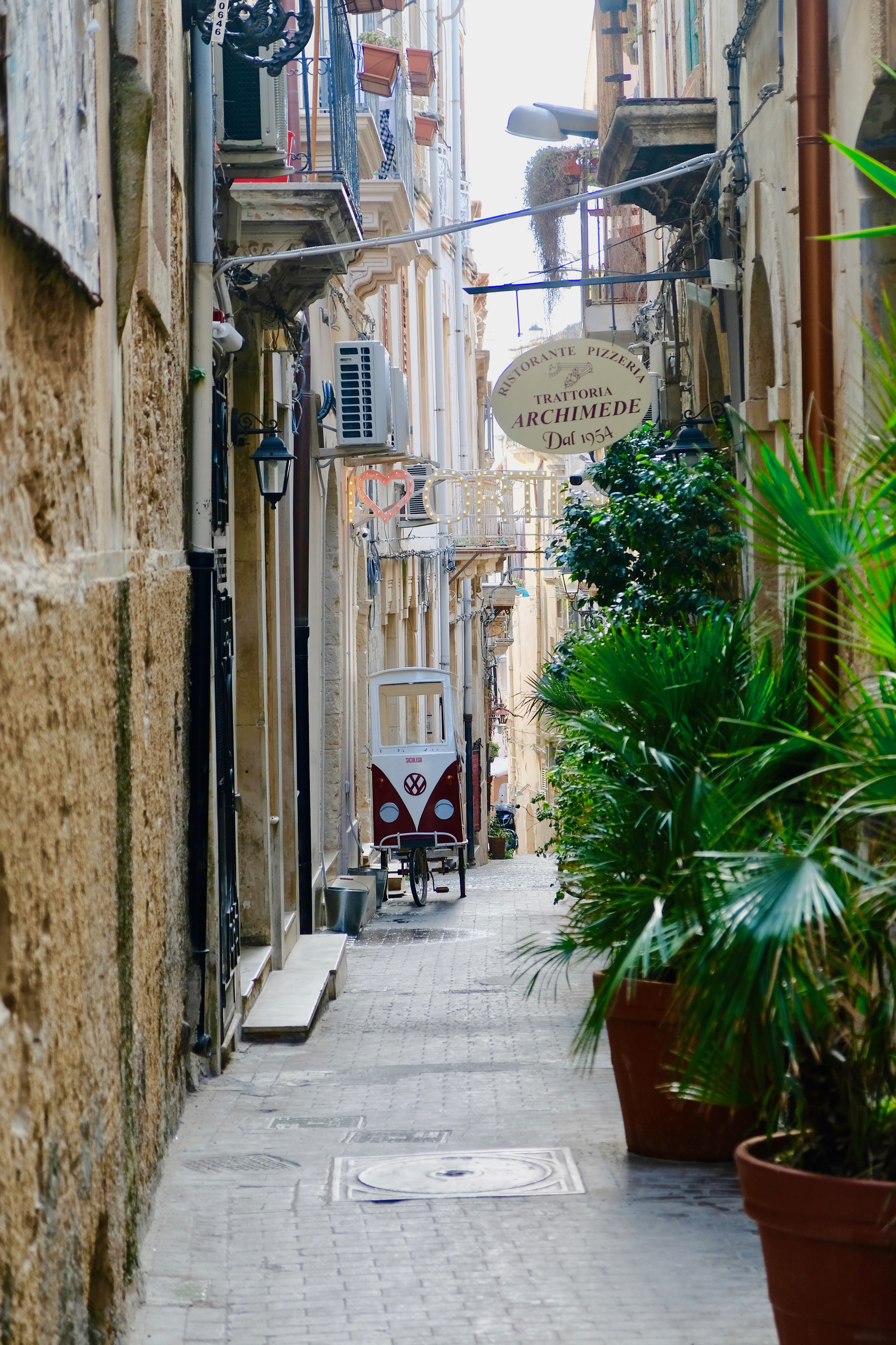 In Syracuse hebben we een B&B in Ortigia, het oude deel. Je kunt hier niet met de auto komen, dus we parkeren aan de rand en laden onze kinderwagen (a.k.a. de Jeep) vol, en door de dikke banden sturen we moeiteloos over alle onregelmatige stenen naar de locatie. Het is er prima, wel aan een straatje, iets gehorig, maar verder weinig op aan te merken!