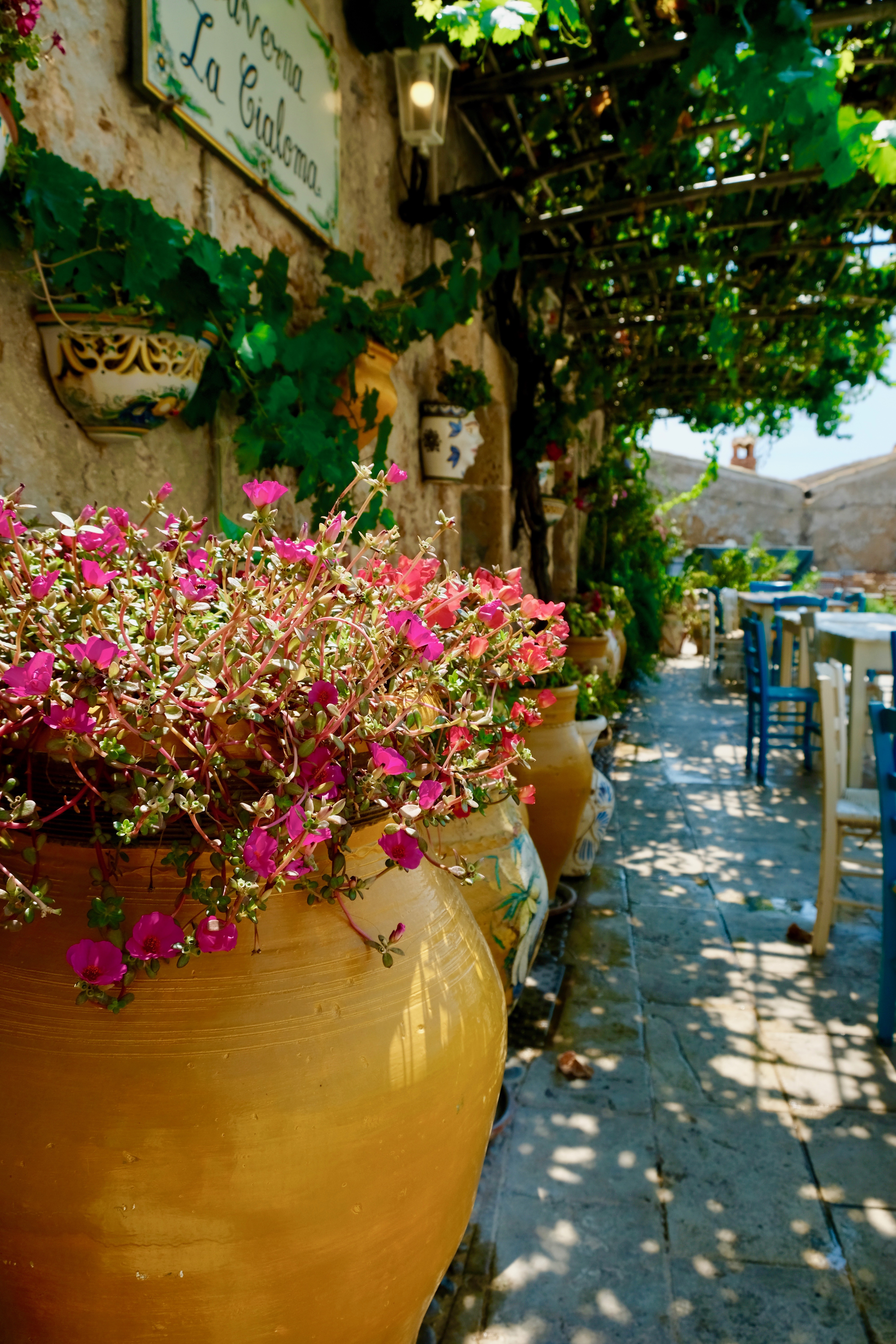 De volgende ochtend is Siebe al om 05:19 wakker.. en blijft wakker. Zo worden je dagen een stuk langer. We gaan op zoek naar de markt (om zeven uur, een iets schappelijkere tijd) en lopen een rondje. Het is leuk, maar niet zo leuk als in Palermo! Ook hier worden alle goederen aangeprijsd, en doen de mensen inkopen. We hebben vouchers om in een typisch Italiaans bakkertje een ontbijtje te halen. Koffie, iets zoets en een sapje. In plaats van koffie kies ik voor granita, een soort schaafijs, granaatappel. Zoet en lekker. We lopen nu het nog redelijk koel is een rondje door het oude centrum, en als het heter wordt duiken we de airco weer in. Vanavond gaan we uit eten, bij de nr. 1 van TripAdvisor. De sfeer is heel leuk, de bediening ontzettend vriendelijk, maar het is geen Italiaans eten. Ach, een hamburger op z’n tijd kan geen kwaad! Wel gek dat dat dan de nr.1. op TripAdvisor wordt in Italië…